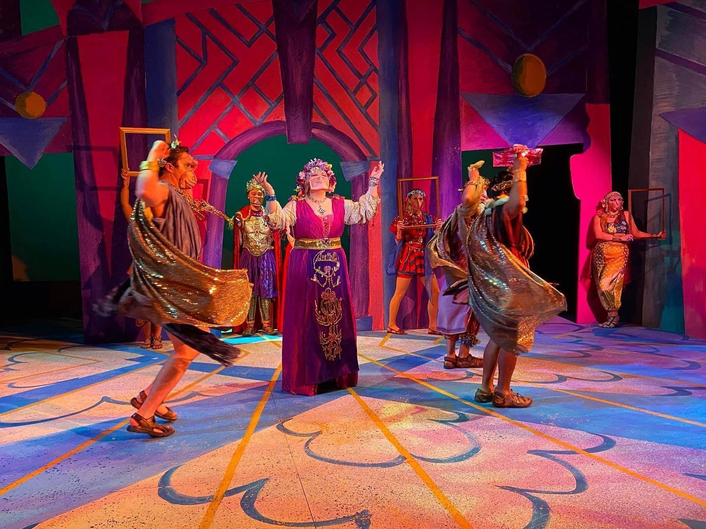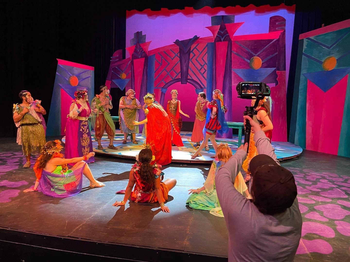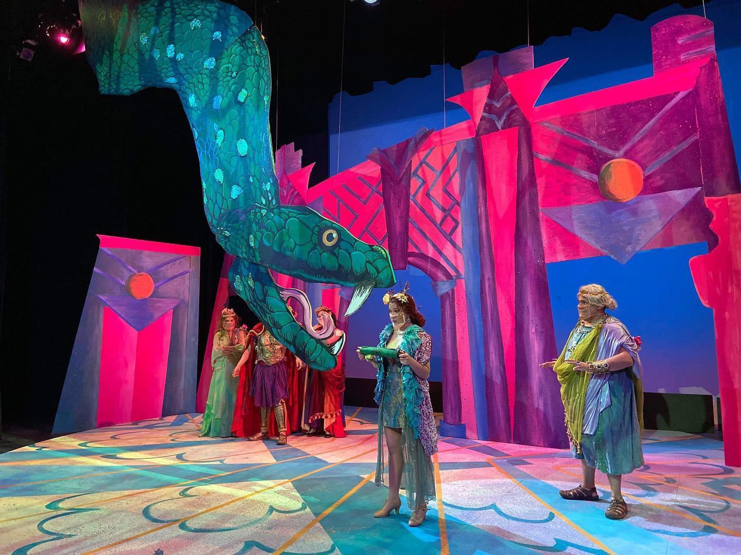 I worked as a production assistant for a hybrid theatrical production of "Head Over Heels". My responsibilities included scenic painter, such as the snake and backdrops, and creating stage dressing. I also assisted in the costume department, mending costumes and supporting the costume designer in preparing the actors' outfits keeping protocols navigating Covid safety.