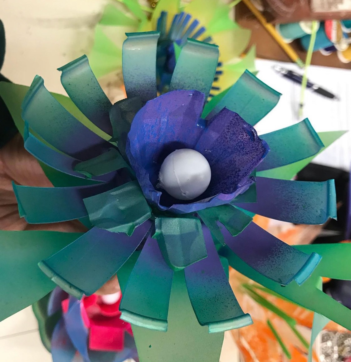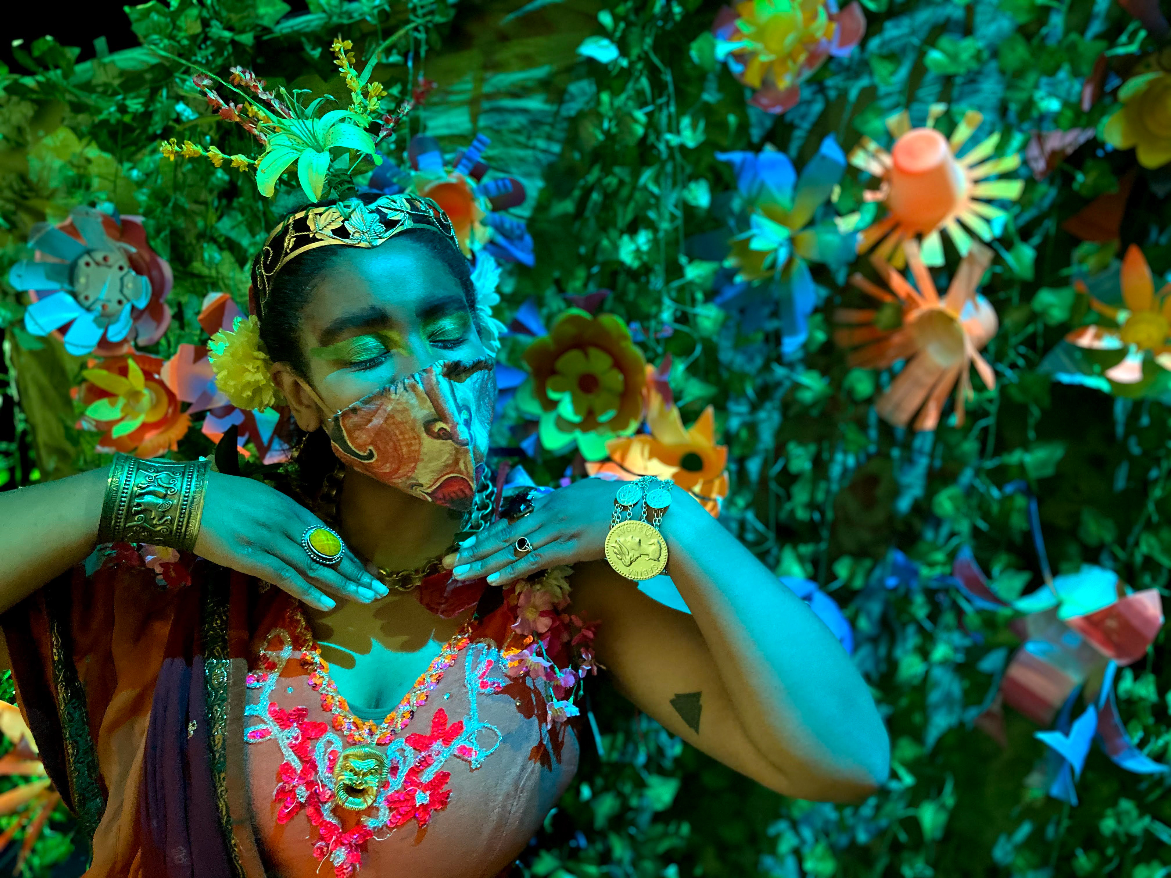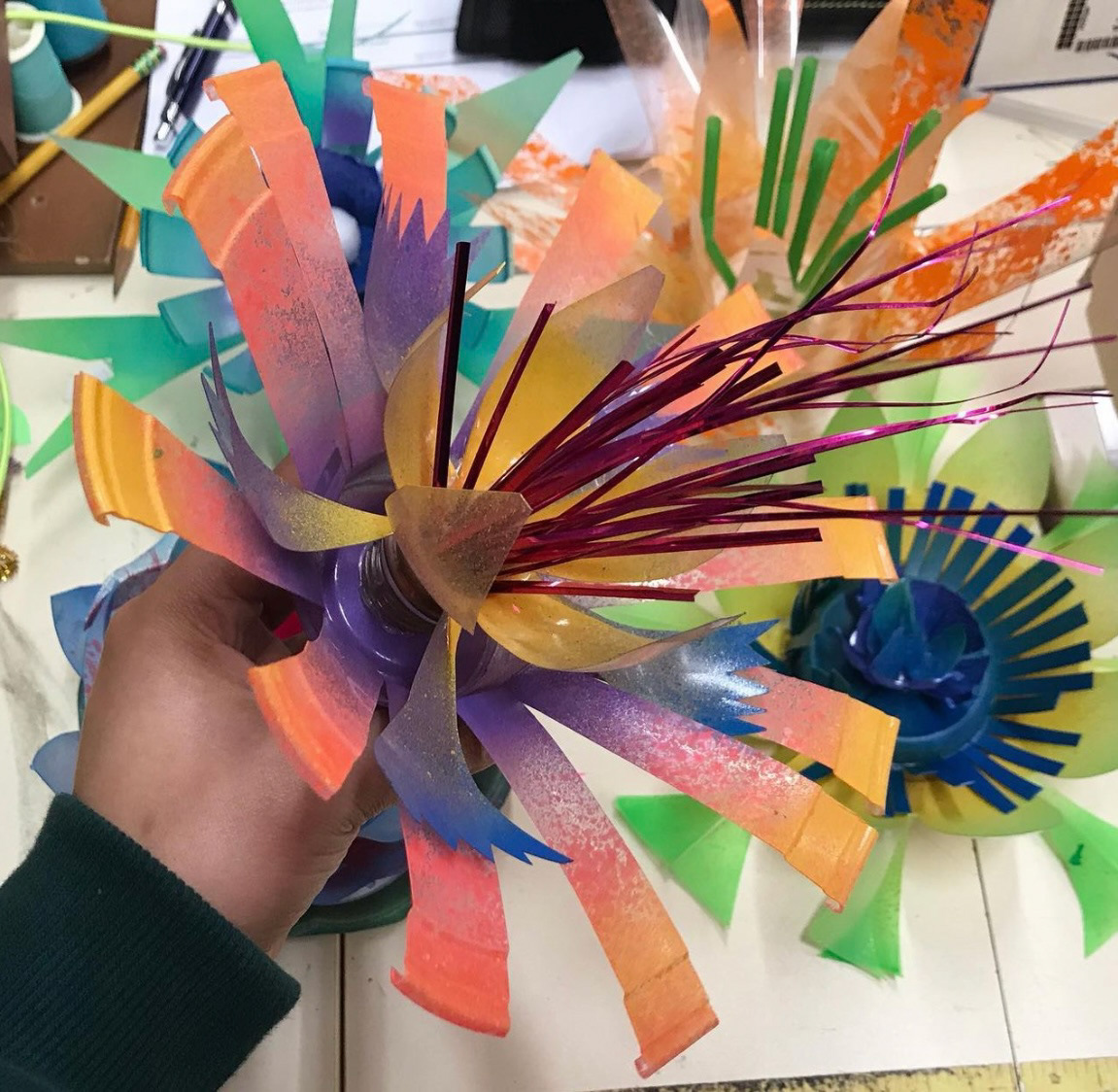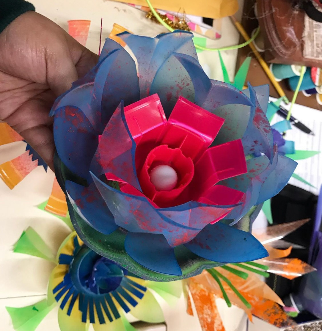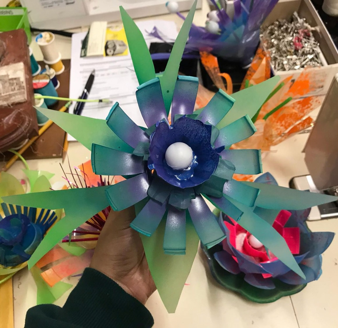 Flowers I made out of recycled plastics to enhance the production’s whimsical fantasy world
