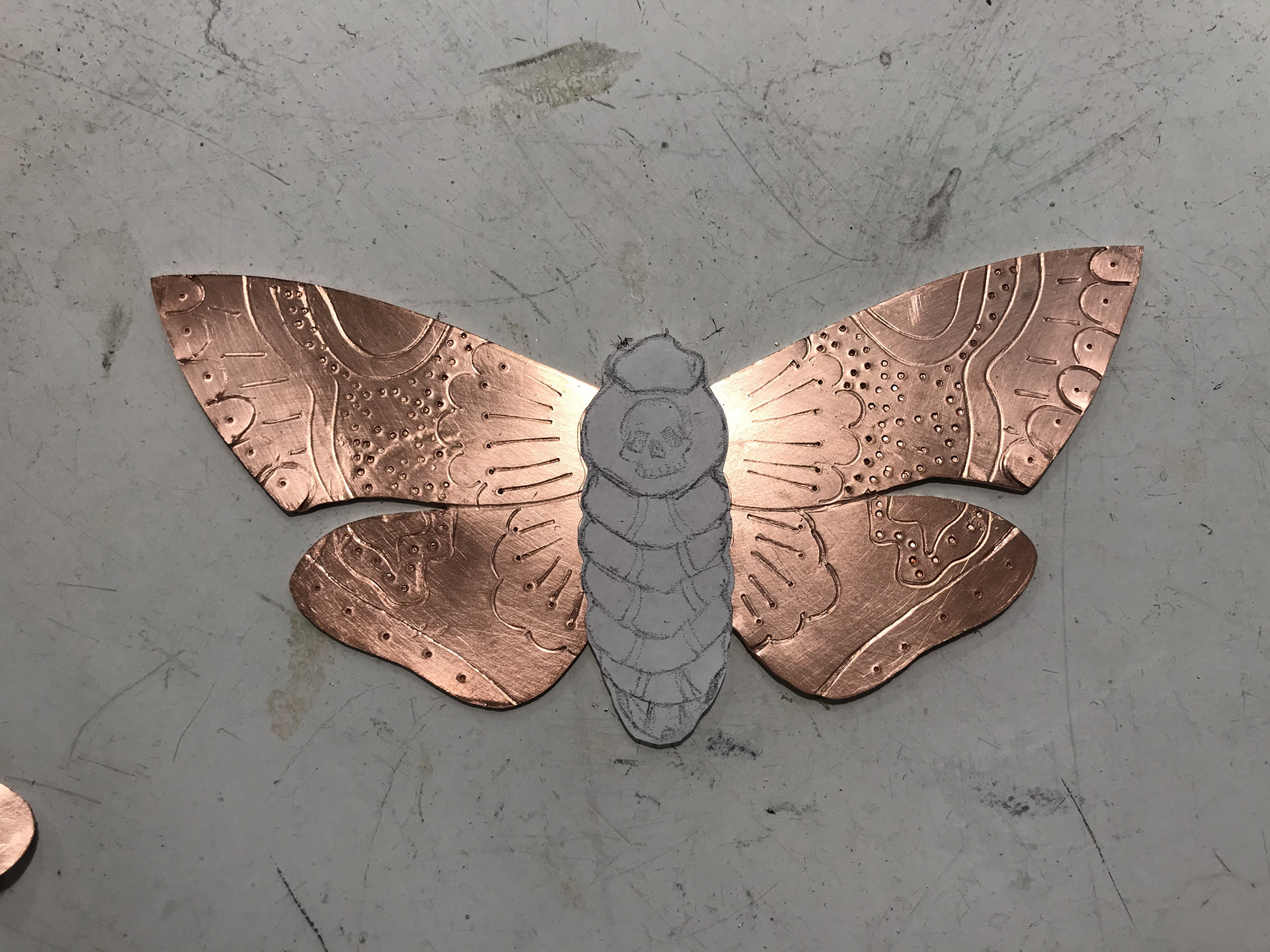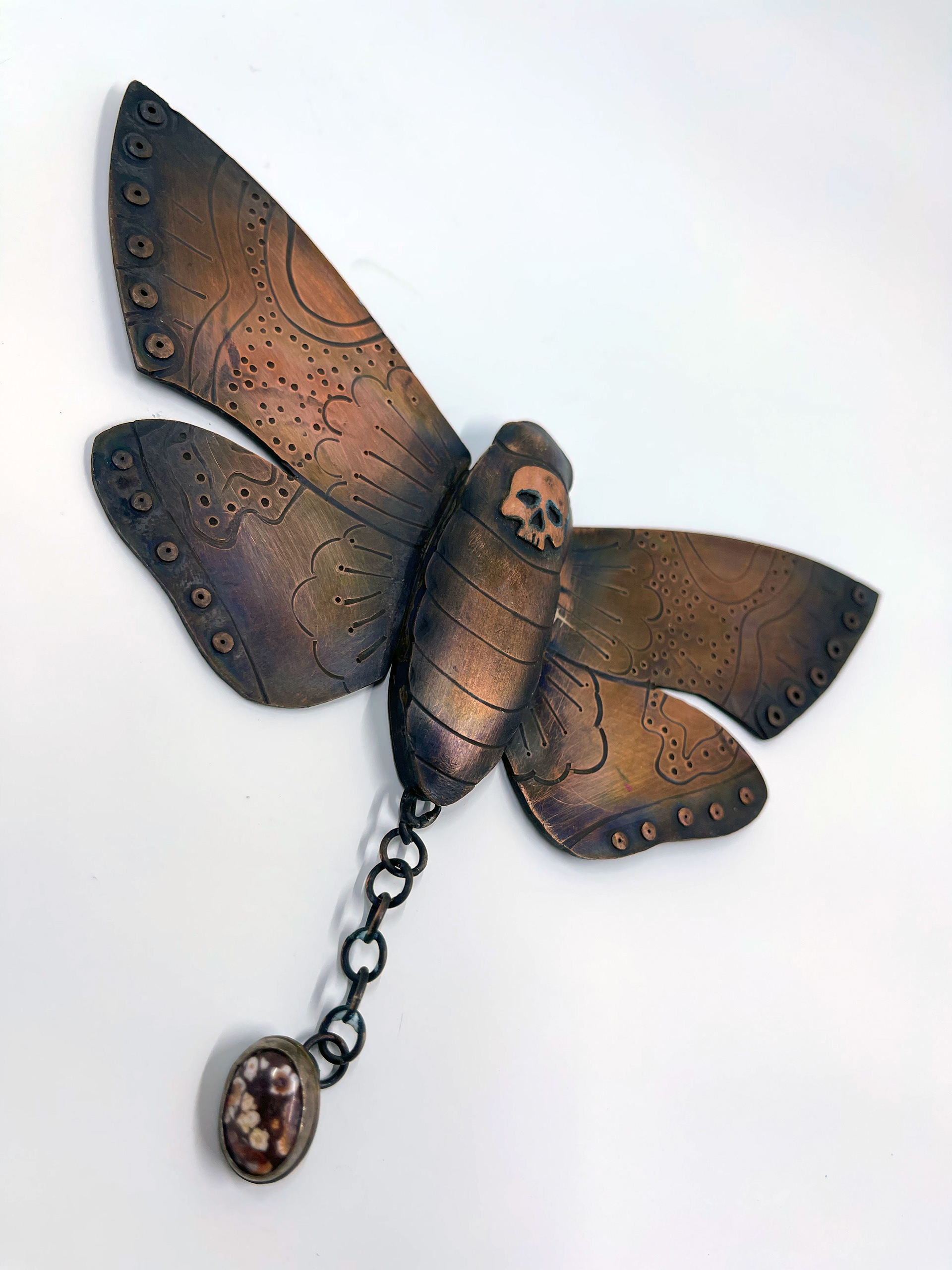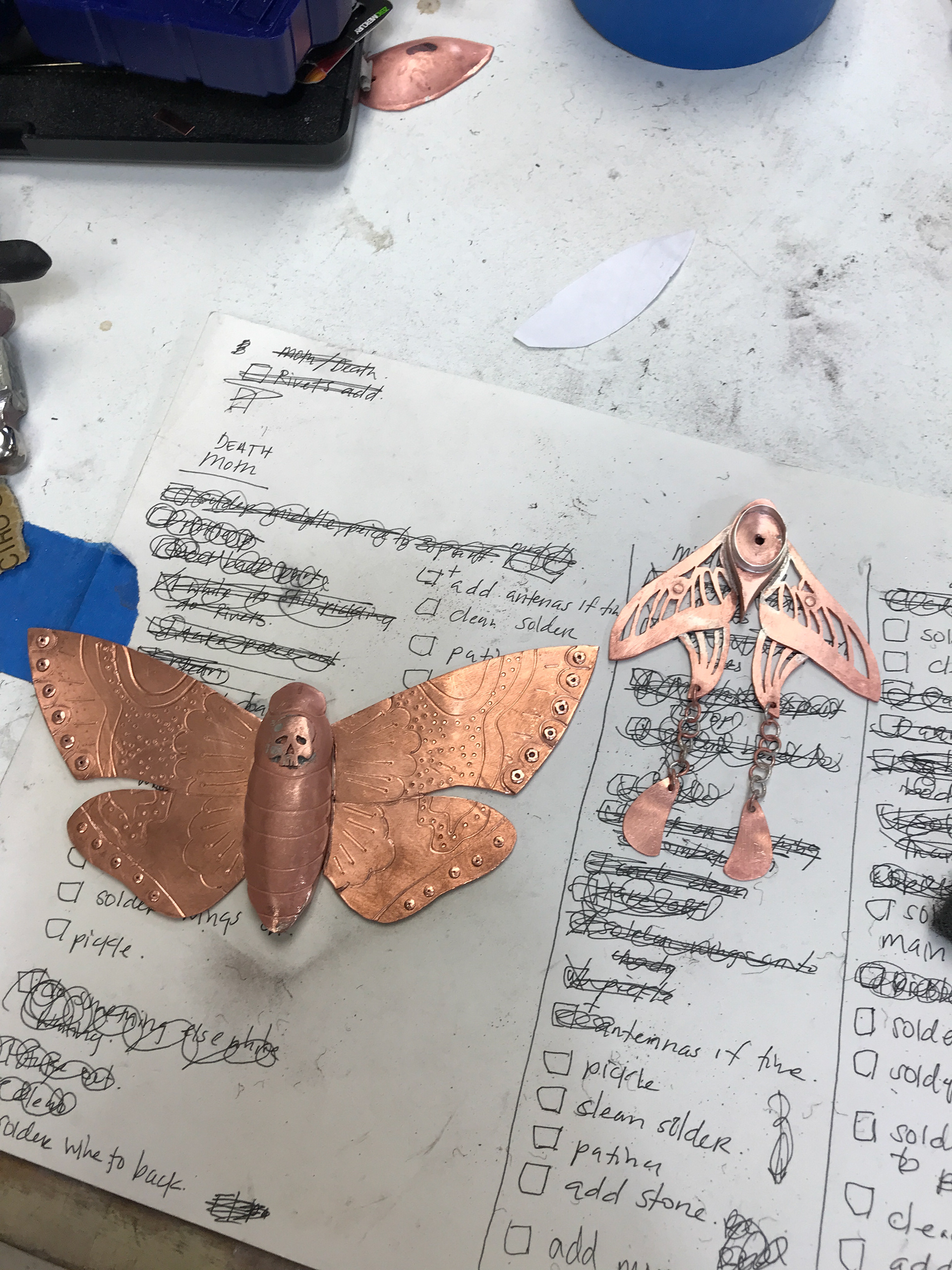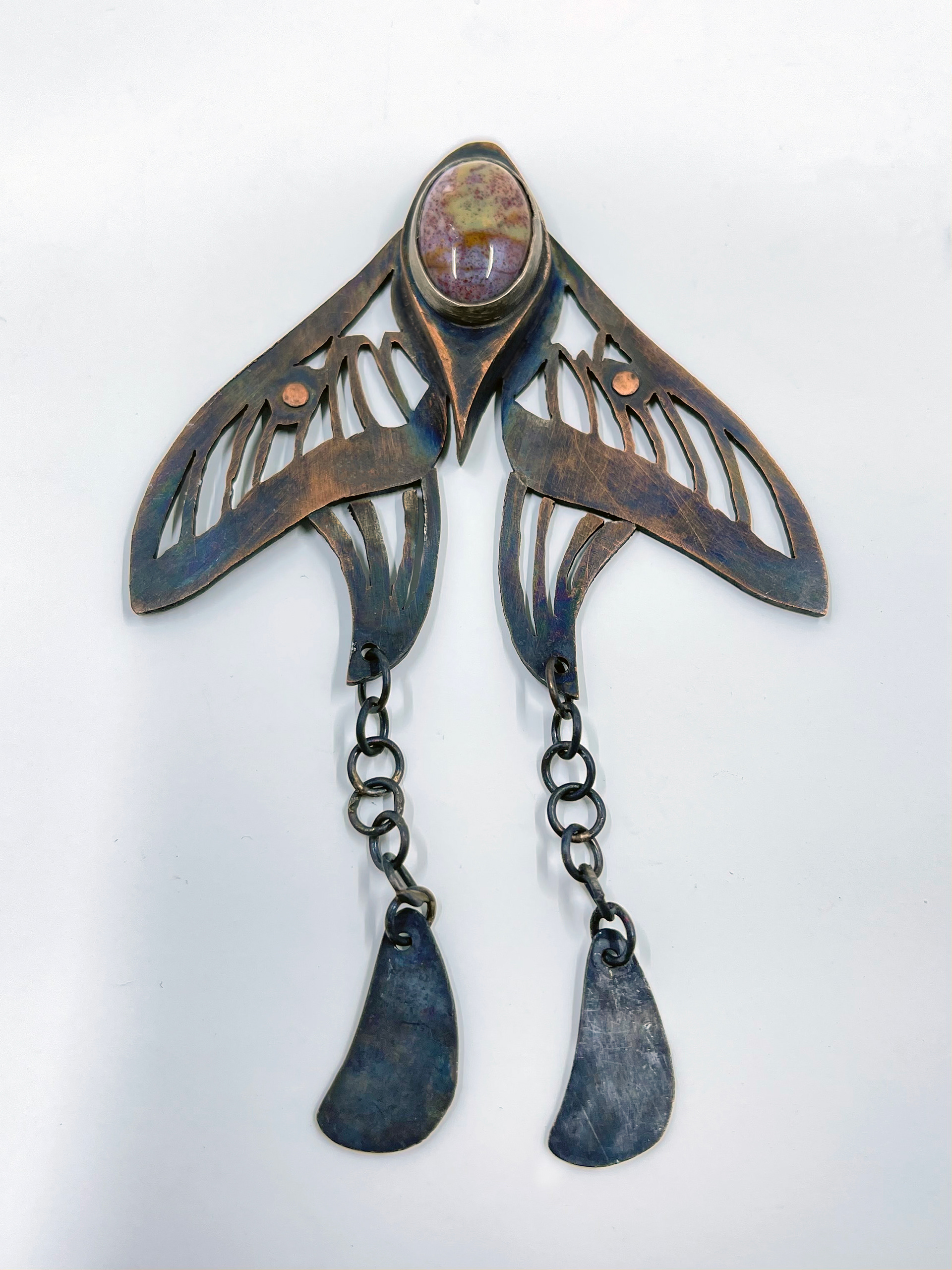 Metal moth collection.Custom die for hydraulic press made to use on Death's-head hawkmoth body. Both pieces have a sterling silver bezel setting for jasper stones. The texture on Hawkmoth has been cut to design then hammered. Annealing frequently to soften the metal. (Luna Moth) design glued on metal and cut with a jeweler saw.