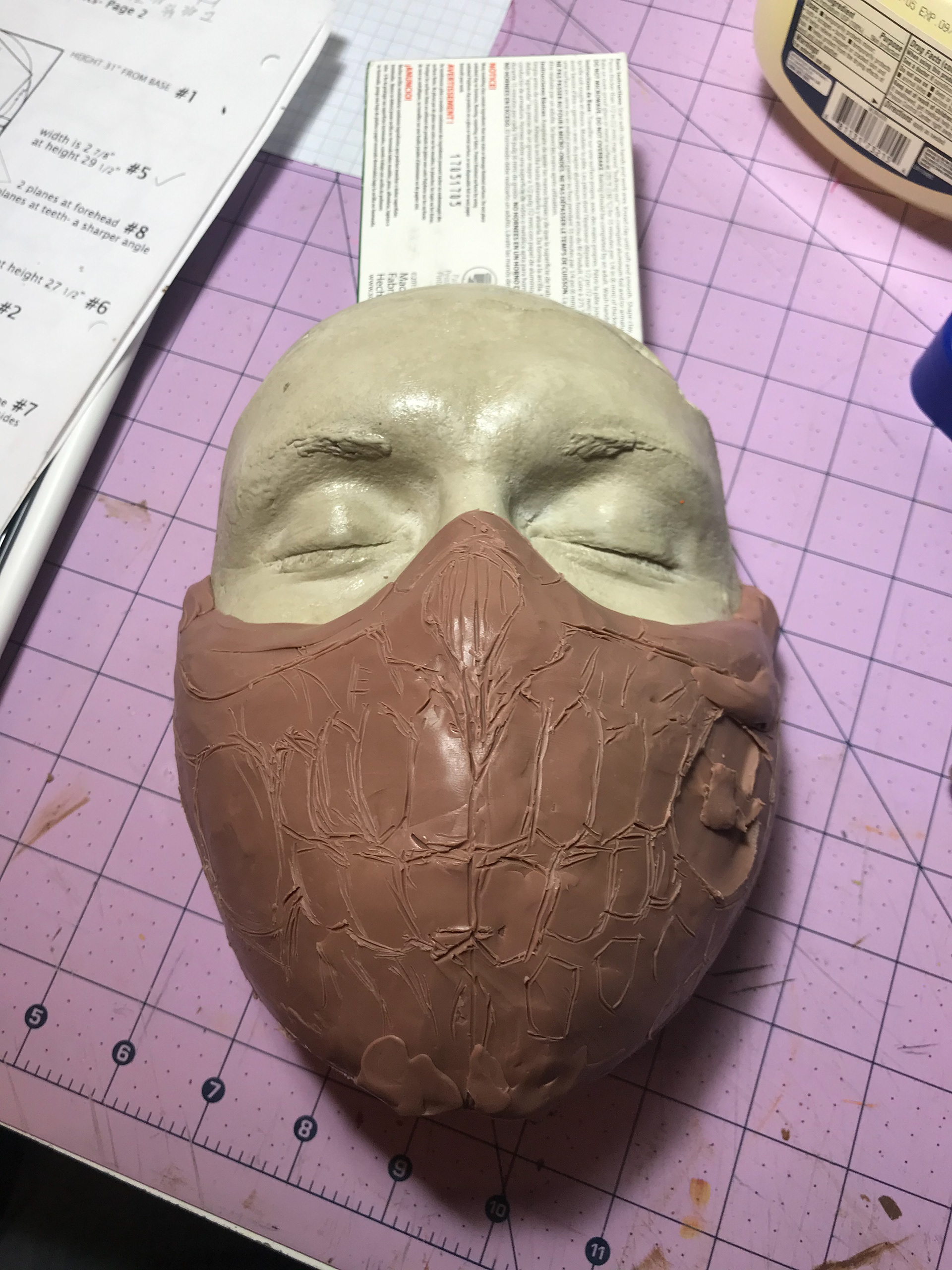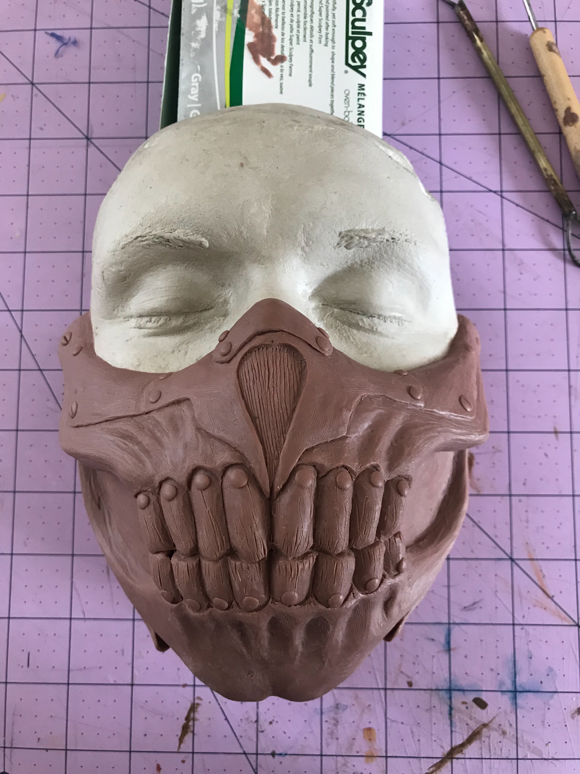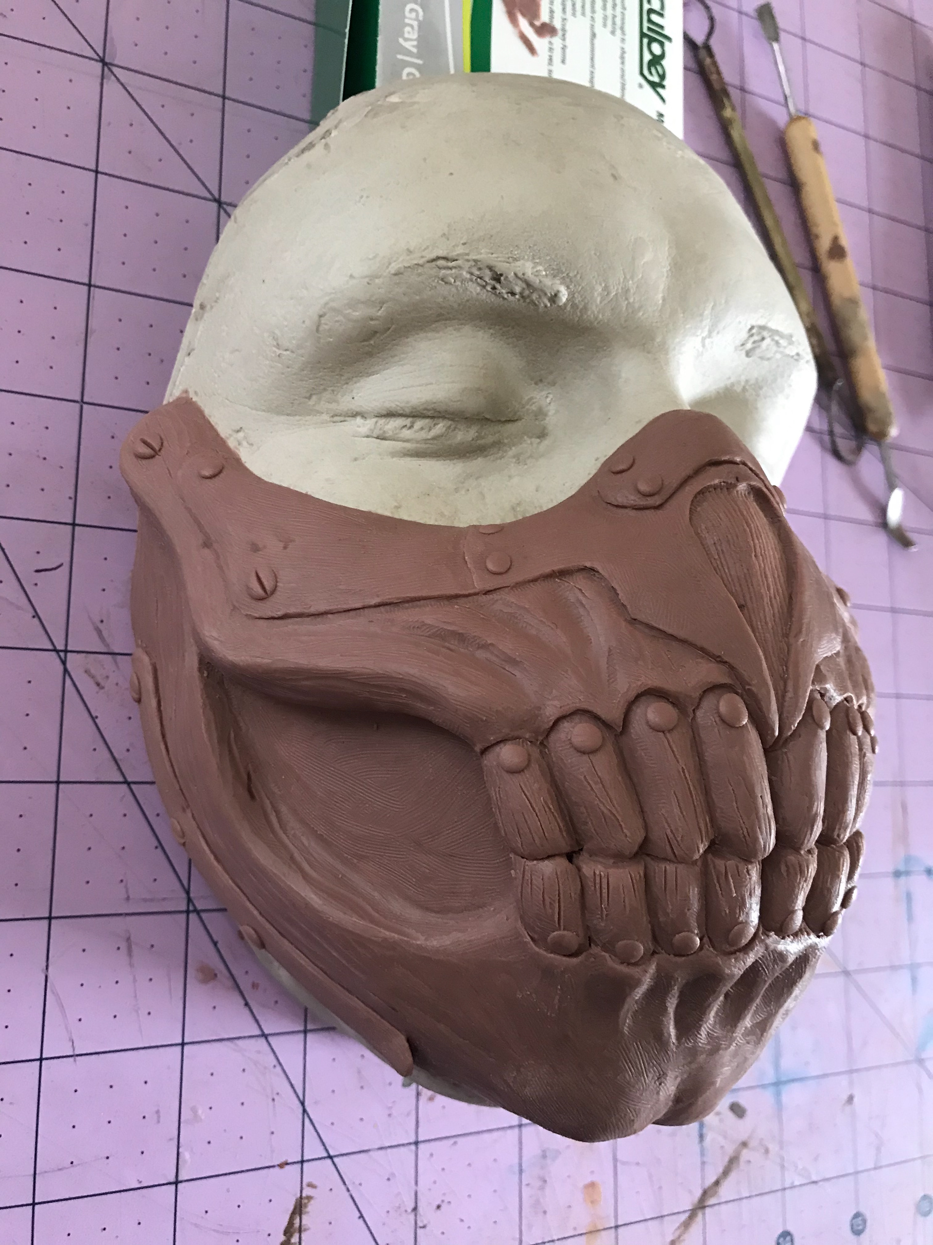 Mask sculpt of the character Immortal Joe from the movie Mad Max: Fury Road. Mask was sculpted on HydroCal cast of my models face with monster clay. I molded the model's face with Body Double silicon with a plaster cloth shell for rubber reinforcment.