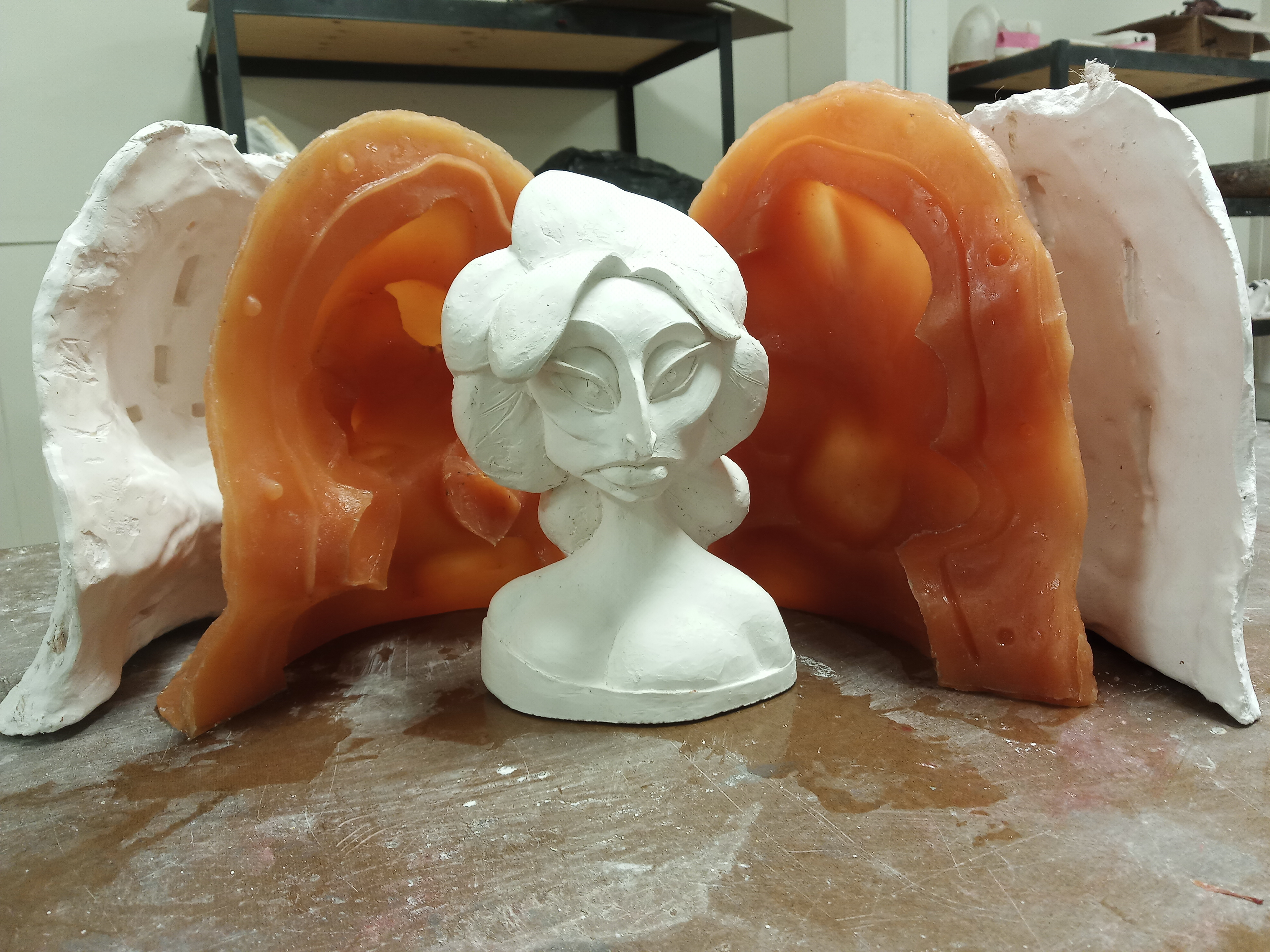 A bust sculpt of Sophia Loren. Modeled in oil clay after a Peter Emmerich illustration. Bust molded in a lay-up fashion. Laid on a WED clay bed, layering up urethane rubber, finishing with a hard plaster outer shell. Hydrocal cast.